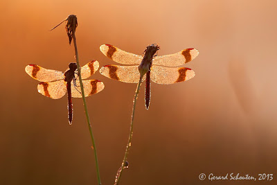 Banded Darter (Sympetrum pedemontanum/Bandheidelibel) at sunrise. I was lovely to be out in the field this early surrounded by dew-covered darters. The backlight and dark background creates ‘silverwings’.